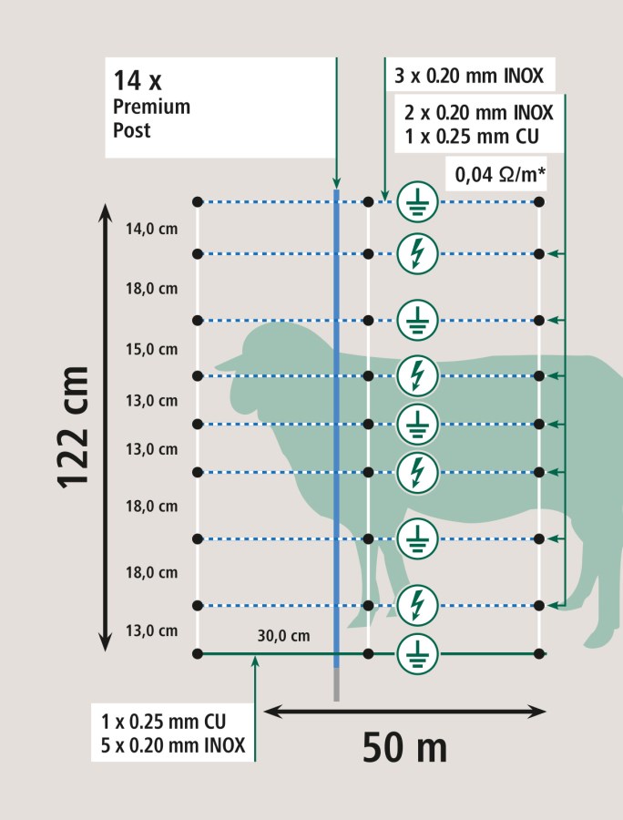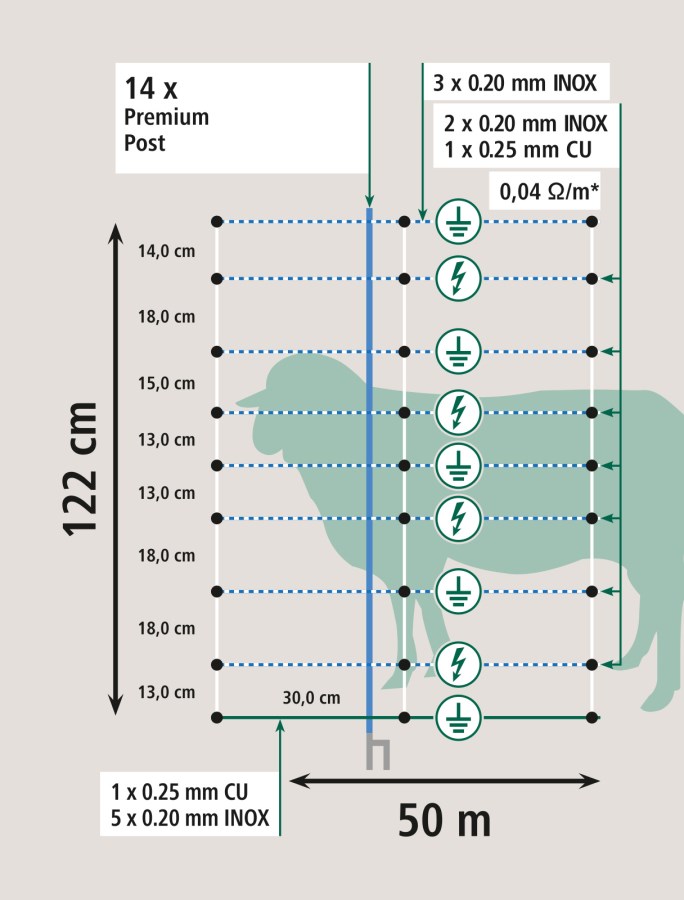 122 cm höjd överträffar kravet på 110 cm för rovdjursavvisande, flyttbara elnät. Den extra marginalen gör att vargen måste göra ett högt och riskfyllt språng istället för att försöka krypa eller pressa sig igenom.